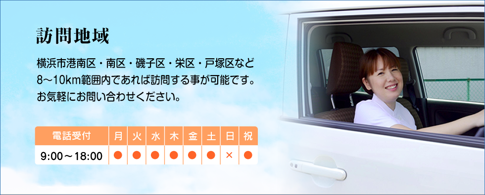 横浜市港南区・南区・磯子区・栄区・戸塚区など8〜10km範囲内であれば訪問する事が可能です。
